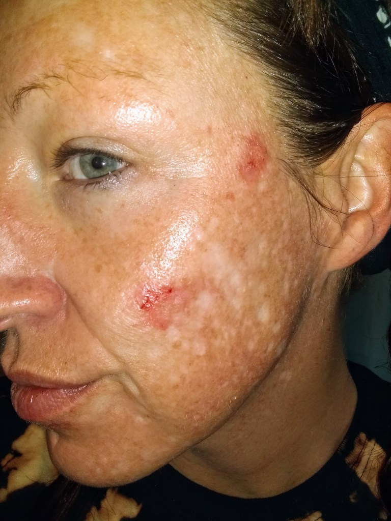 Because I have disfiguring facial lesions, this means SPACKLE. Yet if this was the only thing needed to prepare for a day of “normal life”, we wouldn’t be doing this here, this baring of souls… this chronically difficult stutter while trying to find the words would not be necessary. This disease is obviously about MUCH more than aesthetics and makeup.